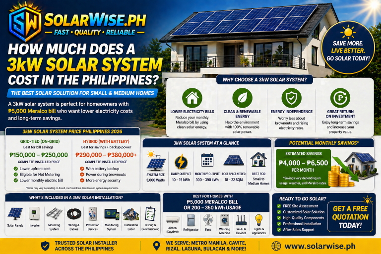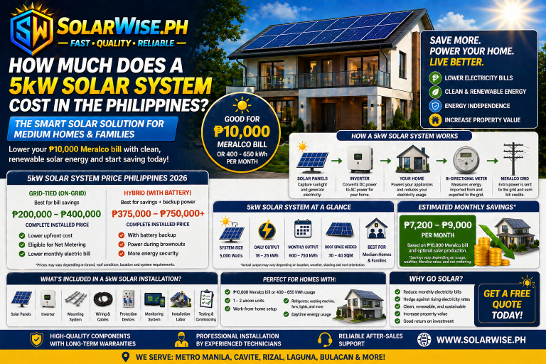 For many homeowners in Metro Manila, Cavite, Quezon City, and Rizal, a 5kW grid-tied solar system is a practical starting point because it balances cost, roof space, and savings potential.