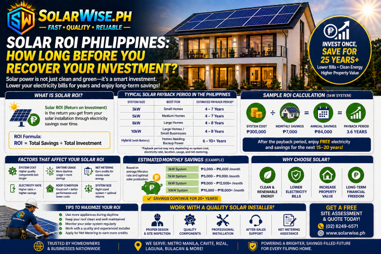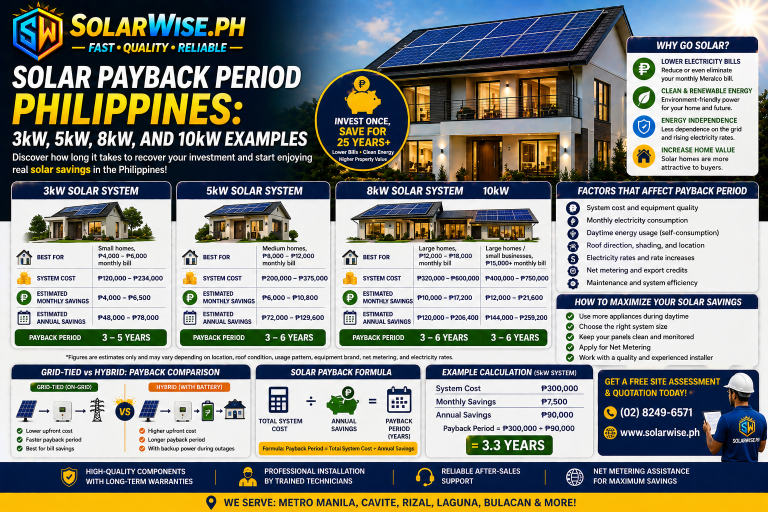 For many homeowners in Meralco-covered areas like Metro Manila, Cavite, Quezon City, and Rizal, net metering can improve the overall return on investment of a grid-tied solar system.